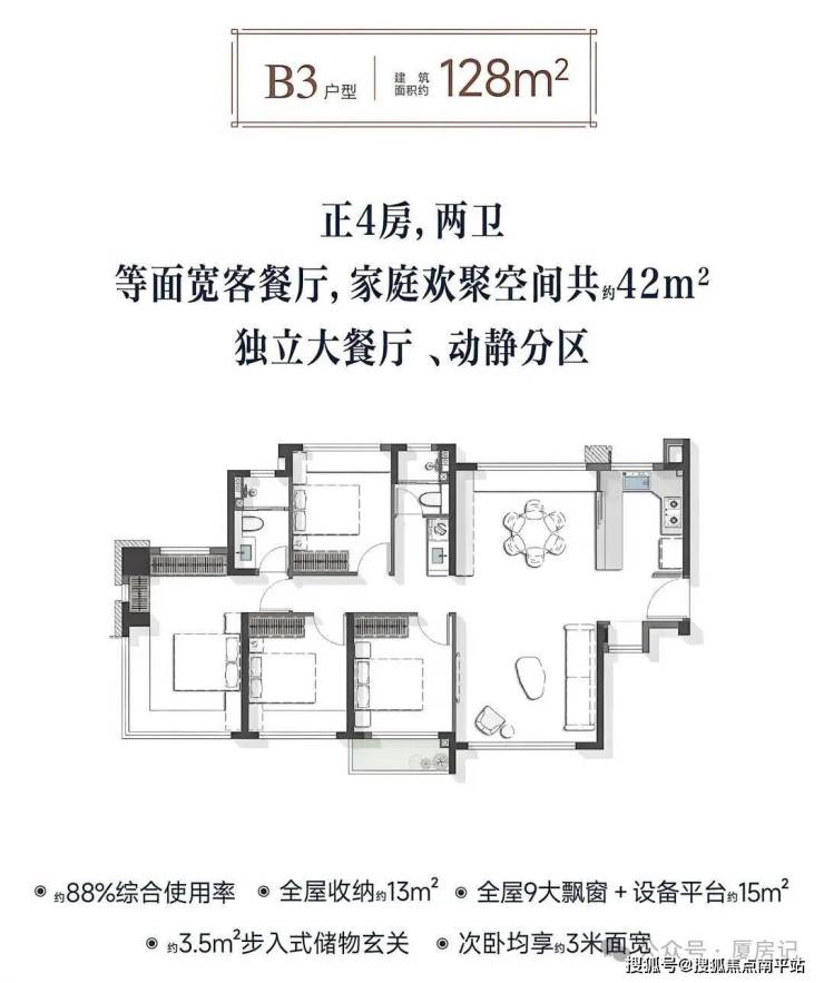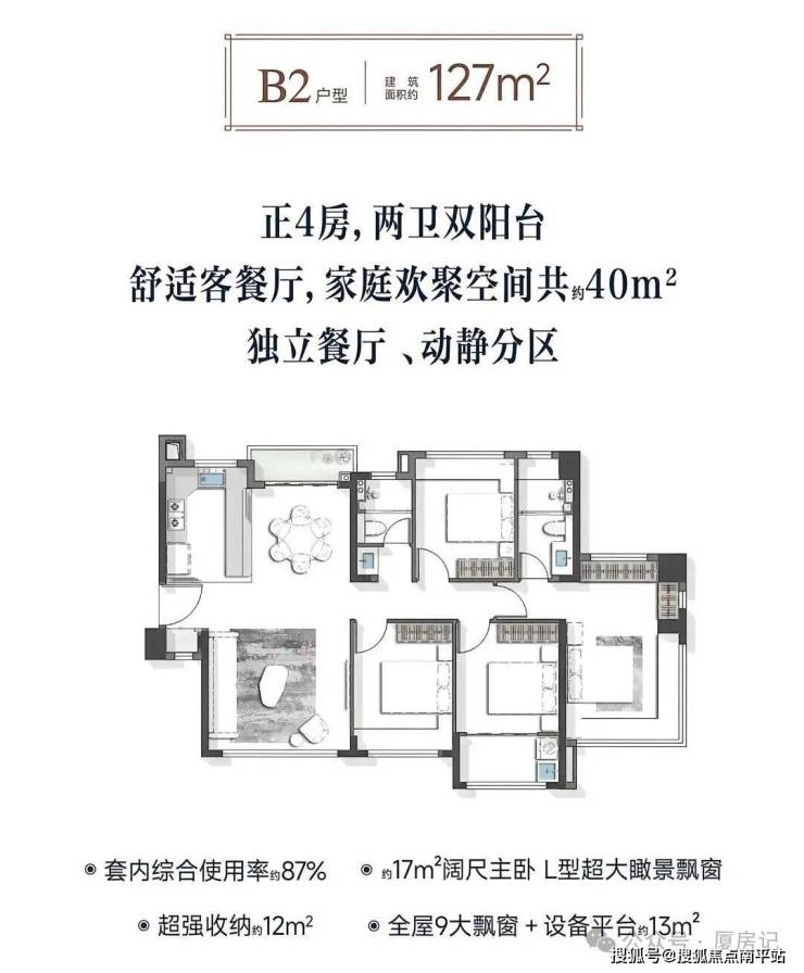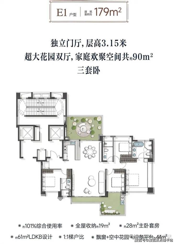 •为“高层+四代宅”组合,全系是100㎡以上纯改善型住宅,户型涵盖建面约104 - 179㎡的四房;