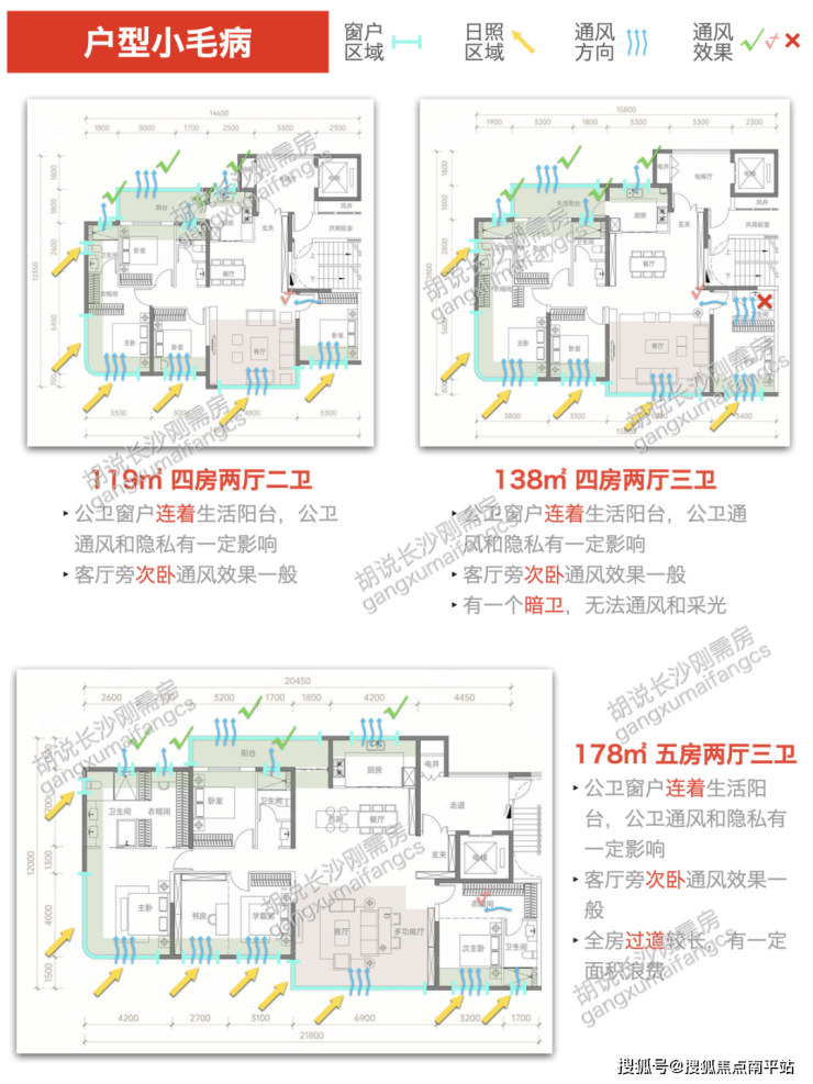 138户型:公卫窗户连着生活阳台,公卫通风有一定影响;客厅旁次卧通风效果一般,有一个暗卫,无法通风和采光;