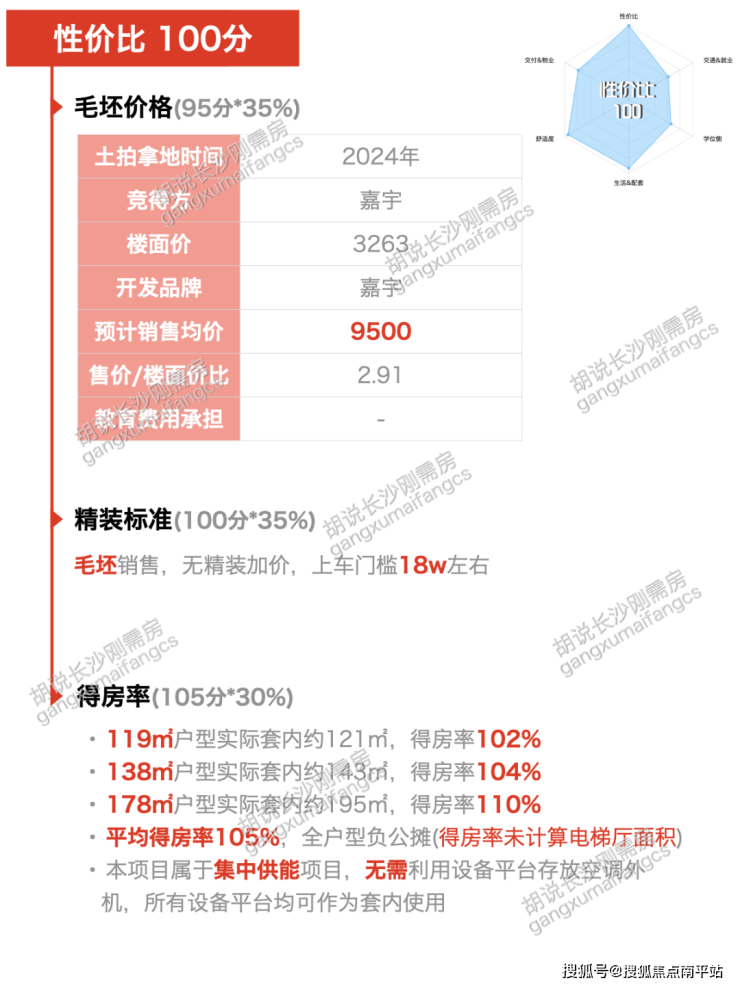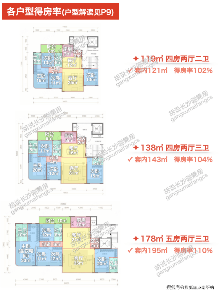 平均得房率105%(未计算电梯厅):119户型套内约121㎡,138户型套内约143㎡,178户型套内约195㎡