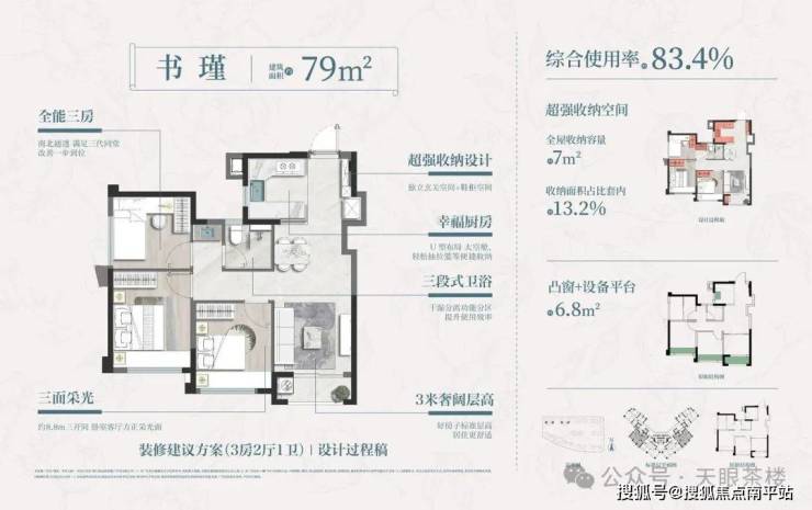 建发书香云锦户型优点明显,全3房设计, 3米层高,低公摊、超强收纳、幸福厨房、 三段式卫浴、高层瞰景.... 79平中间套类边套设计,89、91平边套设计,均做到三面采光,其中91平还带南北双阳台....还有建发品质+建发物业的Buff双叠,预计会非常受市场欢迎!