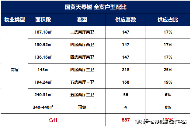项目产品涵盖107平至240平三至五房。主力为143平四房占比25%,其次为194平五(4+1)房占比19%,107平三房、130平四房、136平四房均占比17%,项目辅以少量240平五房及顶复产品。
