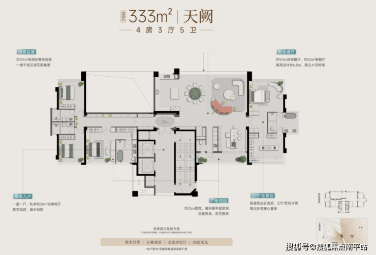 333㎡天阙(4房3厅5卫):以“一层一户”私密格局,私享约21㎡电梯明厅入户。约9.3米阔境横厅,搭配50㎡一体化客餐厅,挑高6.5米尽显大宅威仪;南北双景&四面采光设计,约53㎡观湖巨幕落地窗直面千亩湖景;主卧尊享270°景观环绕,匹配塔尖圈层的尊崇生活。