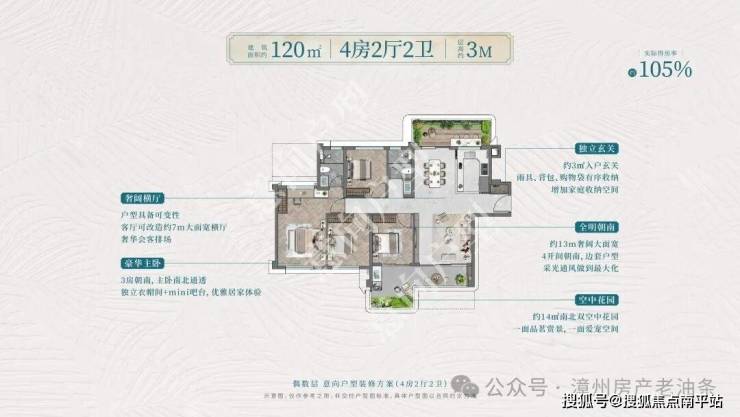 105平做四房房客厅面宽约3.4米,做三房客厅约5.8米,层高3米