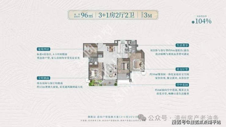 96平做四房客厅面宽约3.2米,做三房客厅约5.9米,层高3米
