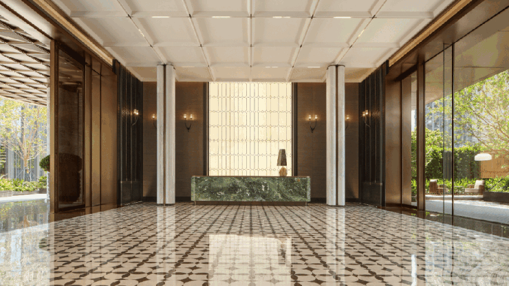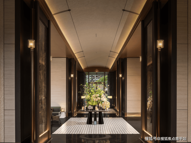 酒店式社区大堂:朝向广场,入口前场、门廊、大堂、内庭院、单元大堂组成的归家动线,配合建筑、景观、室内、标识、灯光一体化设计,汲取糅合后的南洋文化元素细节,把酒店式归家仪式感拉满,彰显非凡气度。