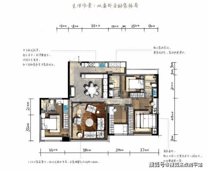 双套卧,奢享新定义:引入“双套房”设计。一侧,主卧套房是“主卧小家化”的高度呈现。主卧可联合打通北向次卧、南向次卧,拥有改造为“酒店级套卧”的广阔潜力——整合打造超大衣帽间与五星级卫浴空间的私享领域。