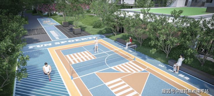 ③登高面优化处理全面升级: 通过跑道衔接健身场地的处理方式,赋予了场地独特的活动功能,弱化铺装带来的硬质感,丰富视觉感受。将登高面与户外运动场地相互结合,通过不同色块铺装打造不同类别的运动场地,美化活动空间,使登高面更具趣味性,满足不同年龄段的功能需求。
