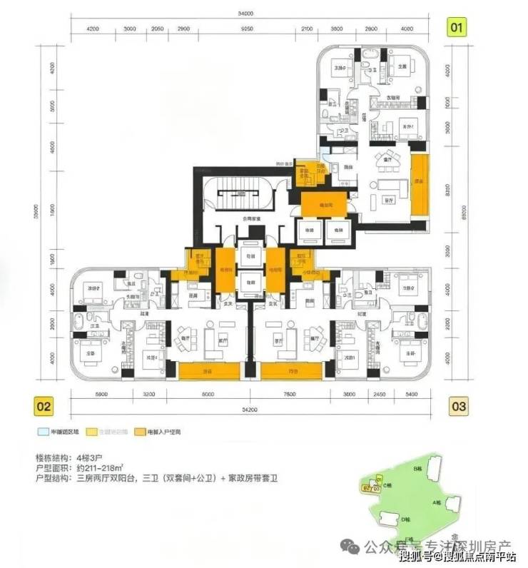 其中01是双梯独门独户,02/03是双梯双门的专梯入户。三个户型都有些许差异,01和02是218㎡,03是211㎡,