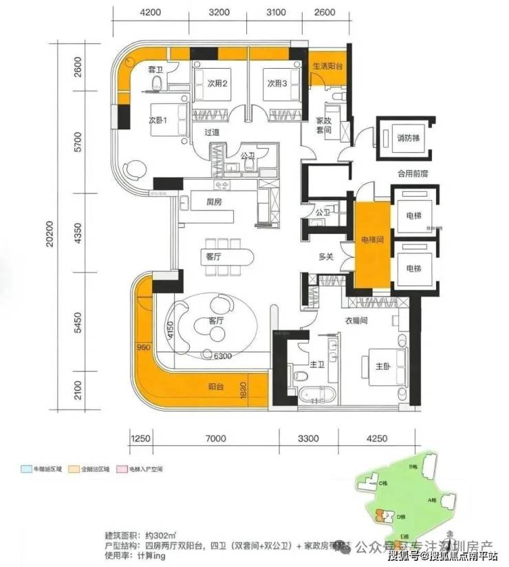 接下来是约302㎡的大平层,这个户型是弓形结构,有点类似「前海时代尊府」的户型。分布在D栋和E栋,3梯2户都有双门梯专梯入户,每层层高3.5米。