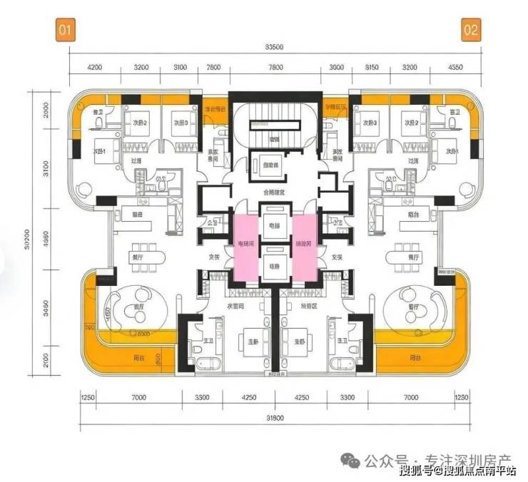 01和02户主要是因为核心筒的结构影响了家政套间和生活阳台的差异,区别并不大: