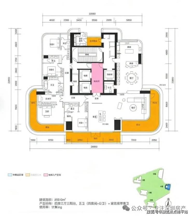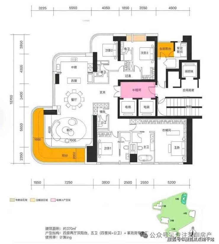 B栋 (约370㎡) : 层高3.5米,四套房,东南,47层,5梯2户,约80余套。