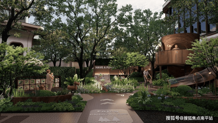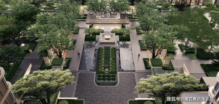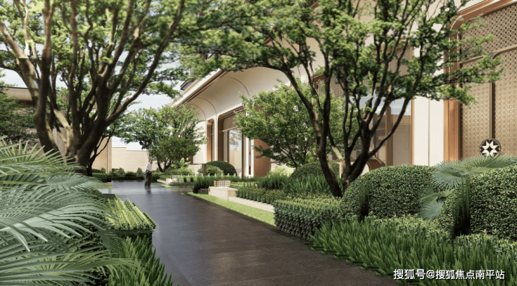 以定制鎏金照壁及“八芒星”超级符号强化归家仪式感与文化认同。立体花园通过下沉庭院、层级台地等手法,形成丰富的高差视觉。约330米超长中轴贯穿南北,以流动水景串联十大花园组团,南区设金乌栖亭,北区筑台辉映屿,作为景观焦点。归家礼道旁列植香樟,社区毗邻双公园并保留百年古榕,构建多层次生态沉浸体验。