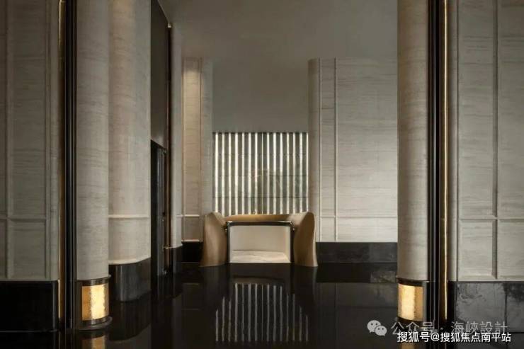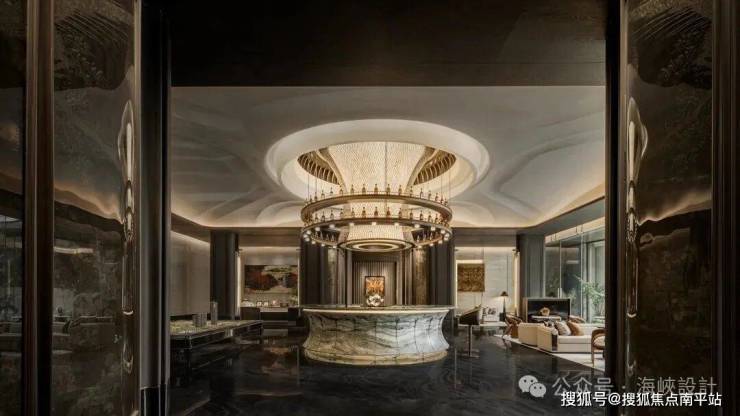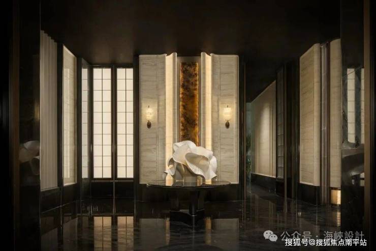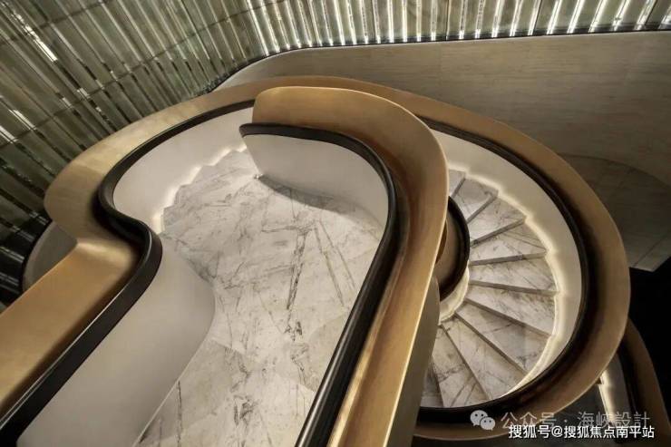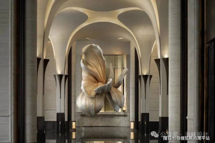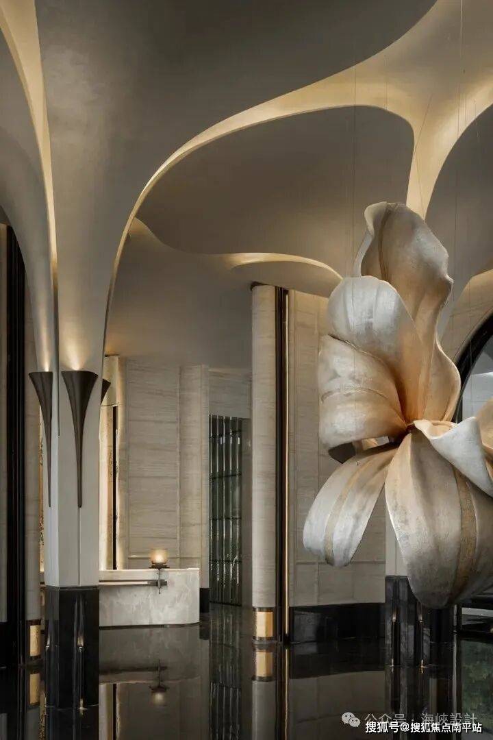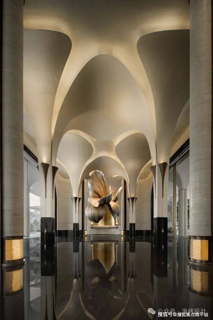 步入前廳接待區,首先映入眼簾的是一座藝術大堂,以極簡的設計語言詮釋了奢華與優雅。空間頂部以福州傳統建築的「弧形」元素為靈感,構築充滿律動和生命力的曲線造型,柔和的曲線與硬朗的結構形成鮮明的對比,交錯的光影營造出層次感,展現出了空間的韻律和自然的和諧美。
