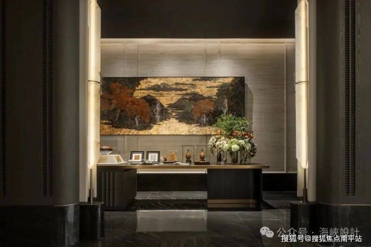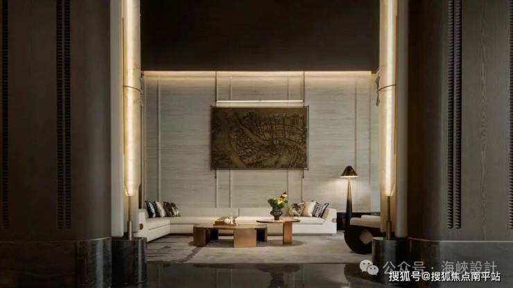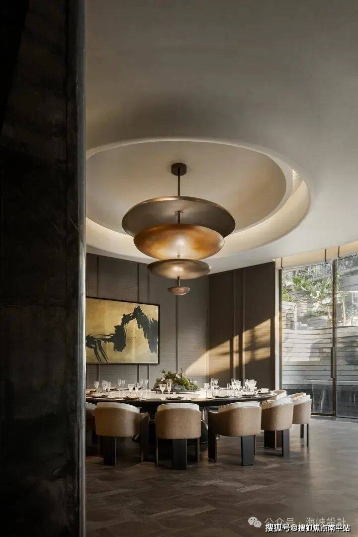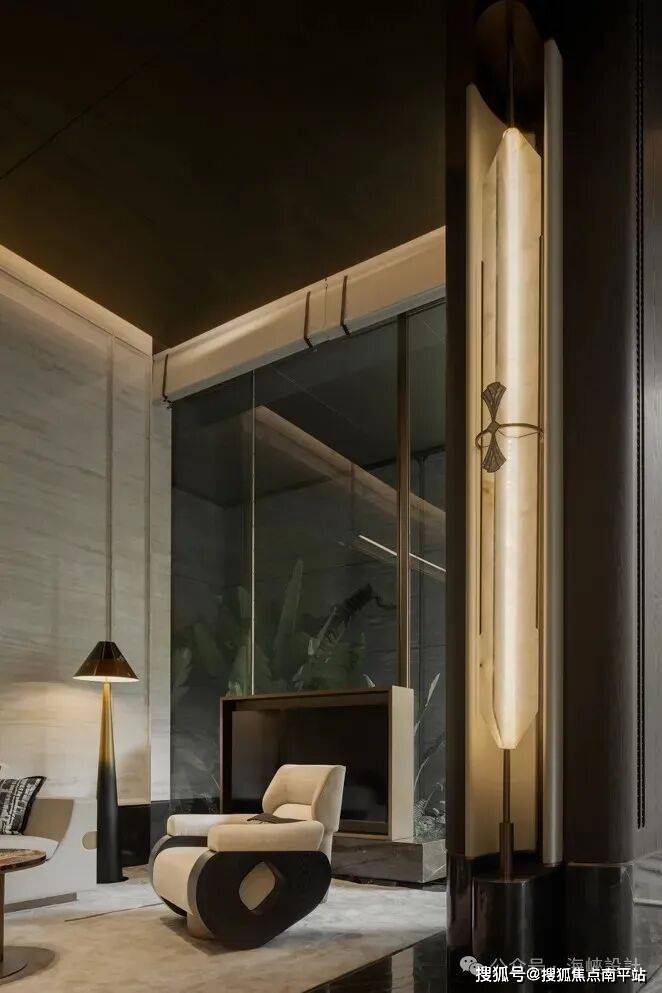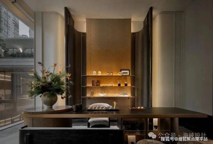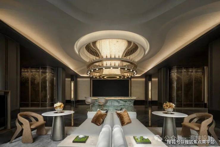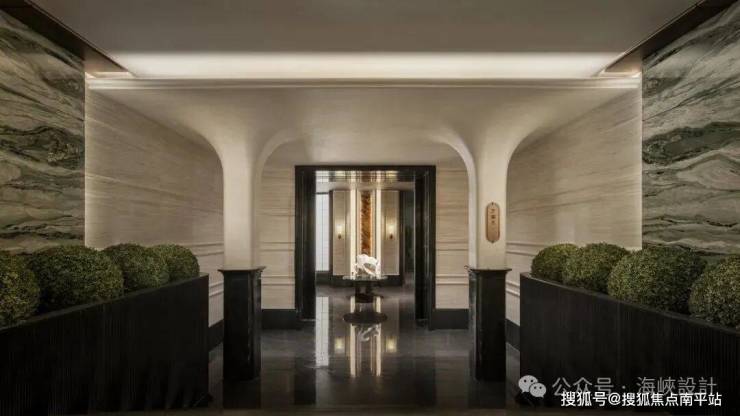 步入前廳接待區,首先映入眼簾的是一座藝術大堂,以極簡的設計語言詮釋了奢華與優雅。空間頂部以福州傳統建築的「弧形」元素為靈感,構築充滿律動和生命力的曲線造型,柔和的曲線與硬朗的結構形成鮮明的對比,交錯的光影營造出層次感,展現出了空間的韻律和自然的和諧美。
