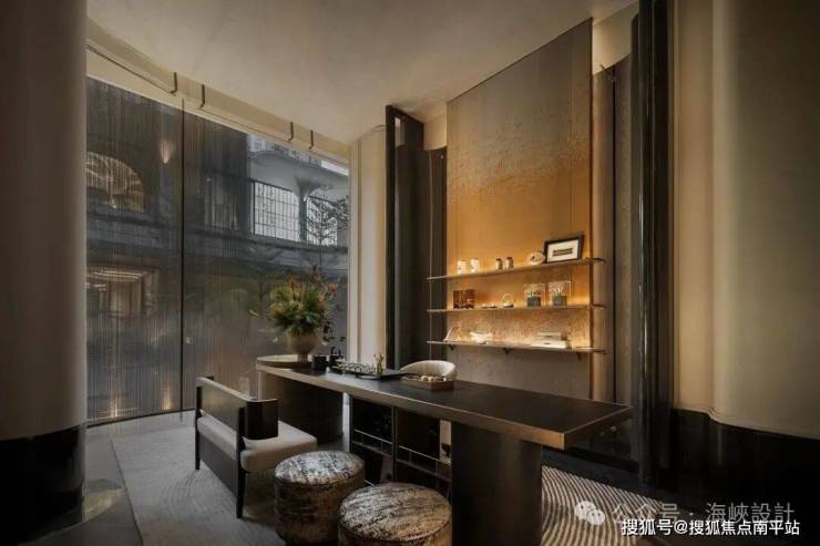 茶室以金屬編織刺繡背景墻為亮點,將東方美學具象呈現。在喧囂的都市找尋一處寧靜空間,感受一盞時光的靜謐,以木飾面構築出對稱式的東方美學,讓賓客在品茶時,感受到品茗的儀式感。