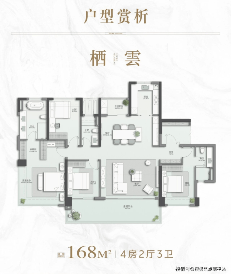 168方为双套房设计,南北对流双阳台, 南向景观阳台约8.9米。
