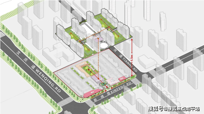 结合规划布局和架空平台进行打造,全架空体系,场地抬升5.5m,平台板按规范比例开洞,效法传统开山理水的造园手法,将仪式礼序融入园林景观,集中设置在地块中央,结合景观设计,形成一条中央绿谷,高架空平台与多层级下沉庭院形成立体街巷,全域绿化,进人尺度体验丰富。