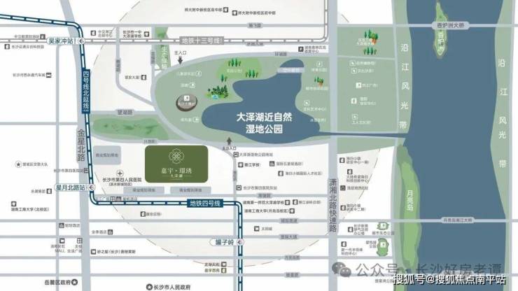 以湘江、大泽湖、月亮岛三大自然为核,形成独特的"江-湖-岛"生态优居体系,同享交通、科创、教育、商业、医疗等核心资源。