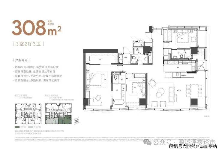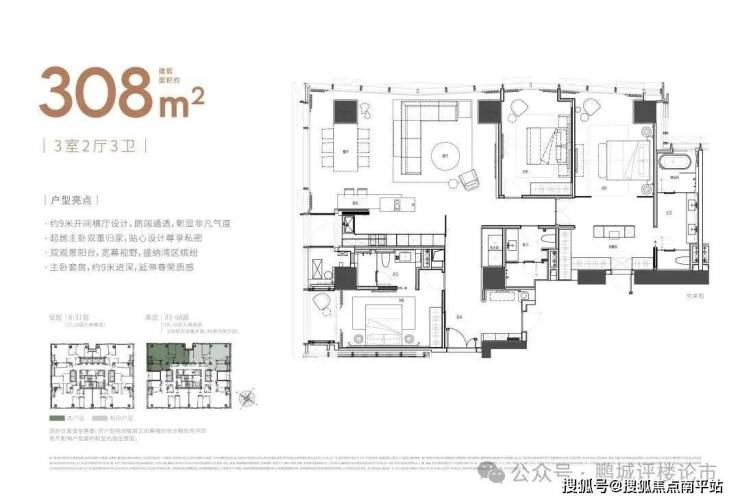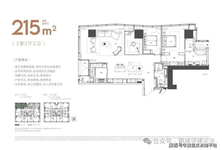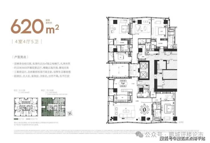 大平面大尺度定位,层高约3.6米,横厅设计确保奢阔观景面,全户型纵享环幕视野。项目打造建面约215-620㎡纯粹品质公寓,顶层为建面约1270㎡公寓产品。