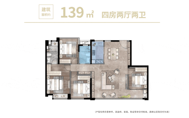 139㎡四房17.5米南向面宽+8.1米景观阳台,主卧套房设计,得房率85% ;