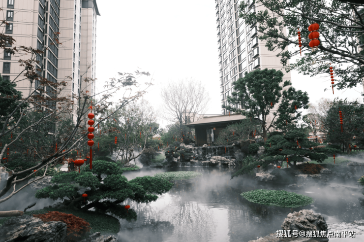 流水瀑布更多是造景噱头,其实就是利用下沉会所的层差,用石头做高桥+金属亭台。书香五缘采用了大量的硬化地面、石头墙面和金属亭台。设计好看,但材质上和湾玺大量不同的奇石+造型树还是差挺多的。