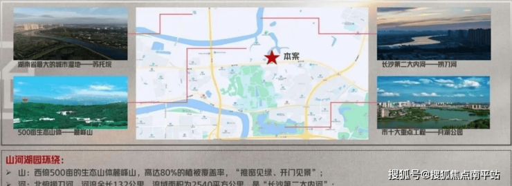项目南临约1003亩月湖公园,西靠500亩生态山体麓峰山,北靠捞刀河风光带和苏托垸生态湿地,坐拥IMAX山景,远眺千米滨水河岸风光,超级绿肺举步即享,繁华都市里的静谧“桃花源”。