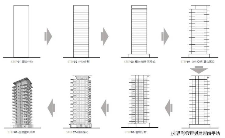 塔楼身段造型从自然界竹节元素中汲取灵感,展现出独特的美学与文化内涵。设计团队提取了竹节所蕴含的优美弧线,并将其巧妙融入到塔楼的轮廓线条之中。象征着积极向上的生长态势,寓意着生活的细水长流与节节高升。