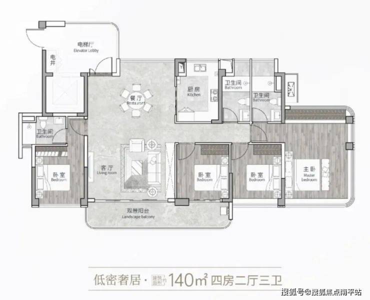 【阅境】建面约140㎡四房三卫,客厅开间达到了5米,约8.3米长的南向大阳台,五开间朝南。