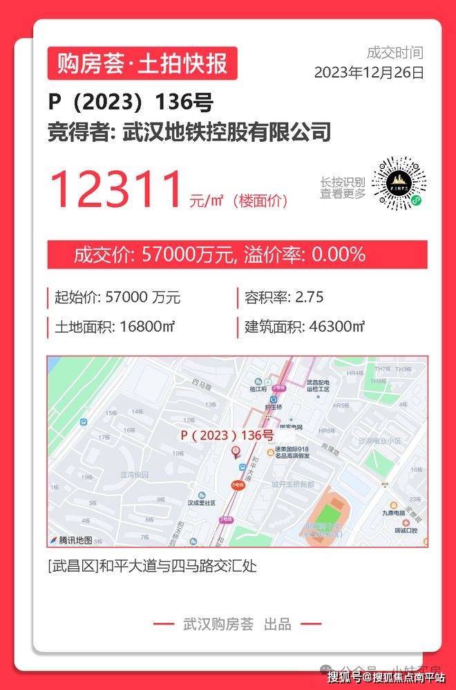 这一地块是武汉地铁集团在2023年12月的土拍中拿下的,成交总价5.7亿,成交楼面价12311元/平。