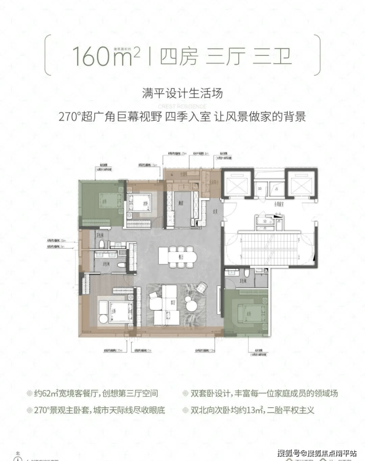 次卧开间均不低于3m,面积可达13㎡,拥有270°L型观景窗,最大化均衡每个房间,提升起居舒适度,北向双次卧,可灵动创变打造大套房,也可作为二胎平权房