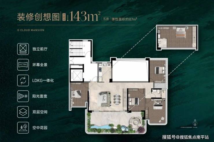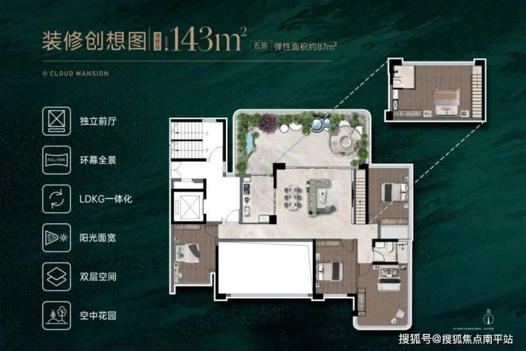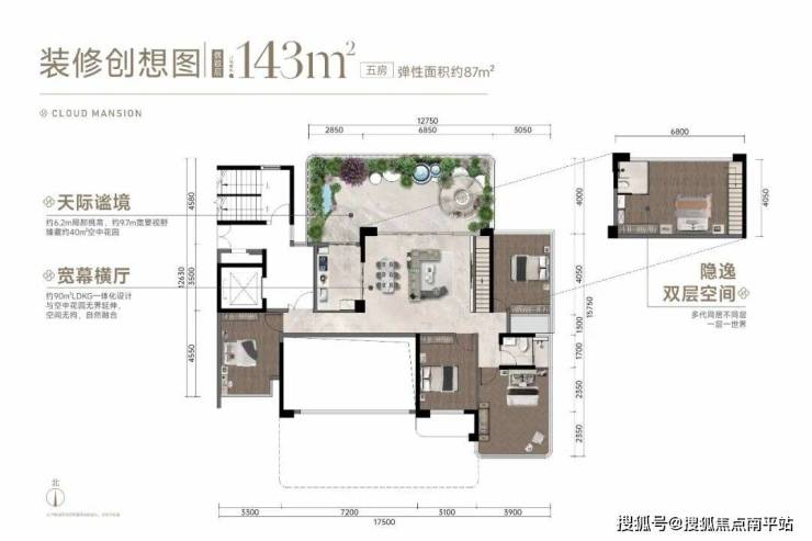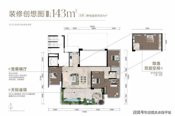 项目第四代住宅空间可拓展面积高达约87㎡,创新外挑空中花园+客厅双层挑高设计,空间灵活适配多代家庭需求。