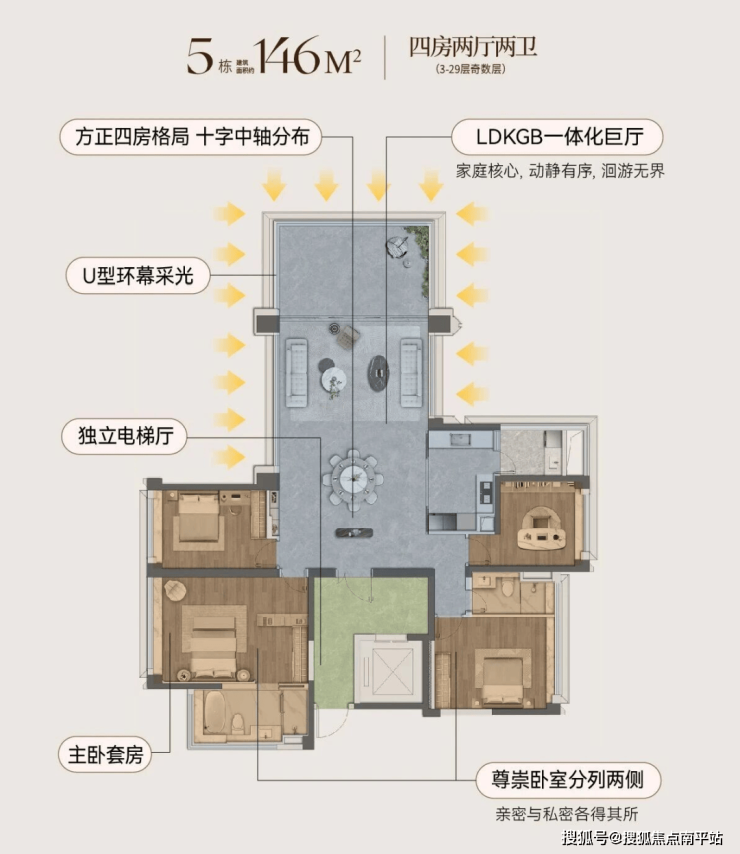 其中,146㎡户型享有市面约160㎡大平层才有的空间感,创新U型全景舱布局,三面采光,实现约18米、约270°环幕视界,约3.10米奢阔层高,空间感与通透感全面跃升,以越级格局带来大平层的居住体验。