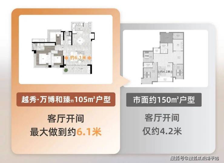 像是 建面约105平户型,整个 餐厅的宽度升级到了约4.3米,客厅开间最大可做到约6.1米!光是整个餐客厅的面积就超30平,媲美市面上约150平+户型的客厅尺寸。