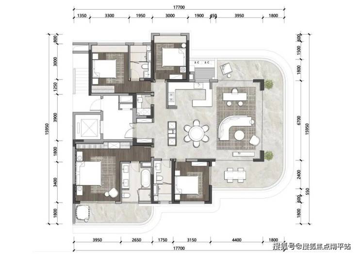 建面积约199㎡户型,20.1m的面宽,四面宽跑道阳台