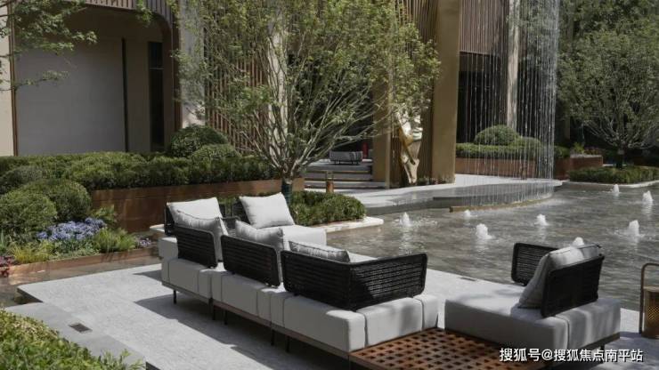 与之相呼应,水面上, 不规则排布的喷泉,就像是玉盘中的一枚枚珠玑,镶嵌在精致的园林景观中间。