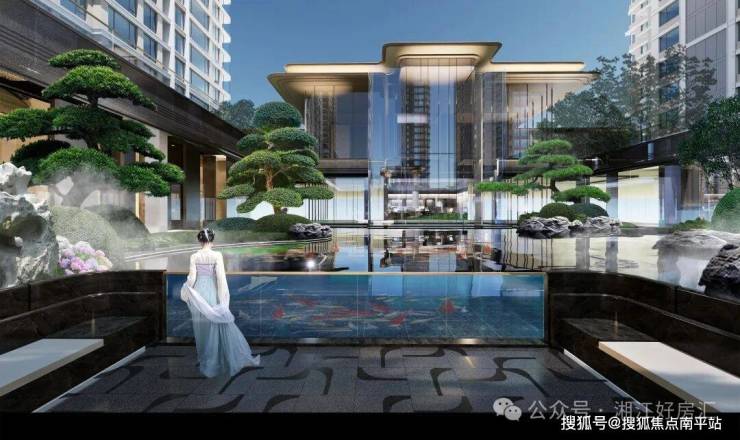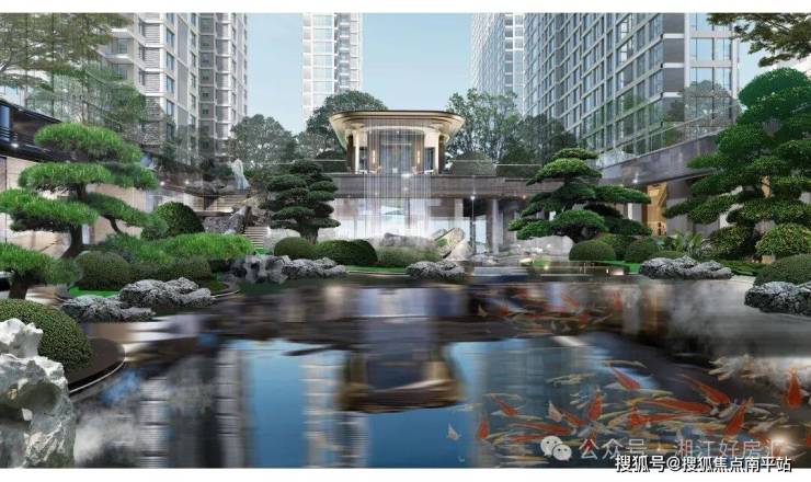 园林的整体风格,依然是润和一脉相承的东方艺术园林, 罗汉松、大瀑布、搭配千万级壕宅的“同款锦鲤池” ,情绪价值拉满。