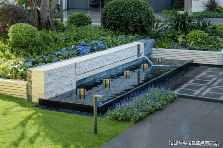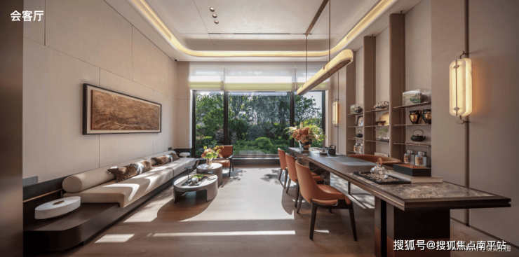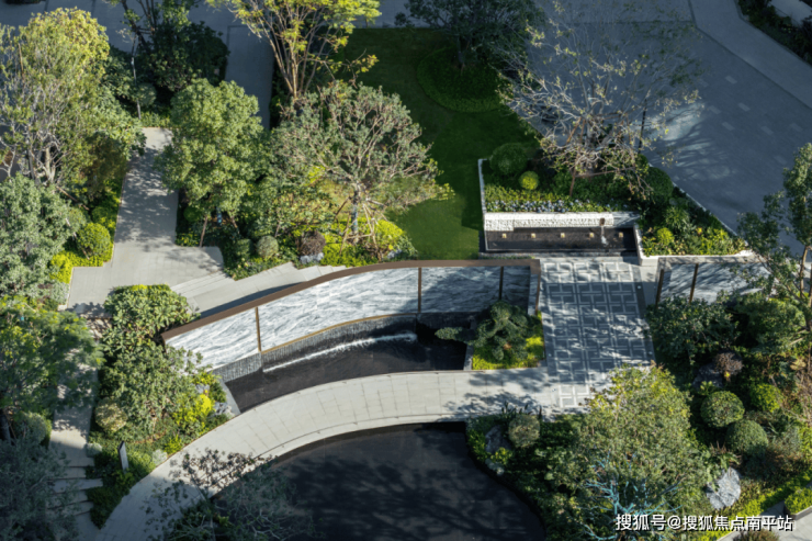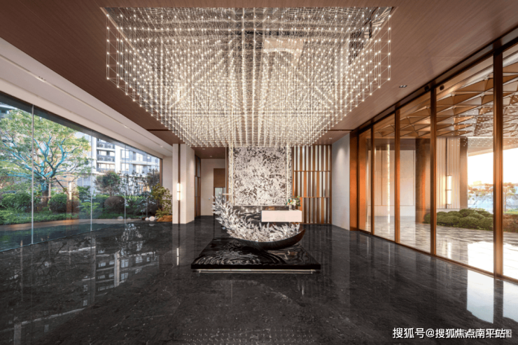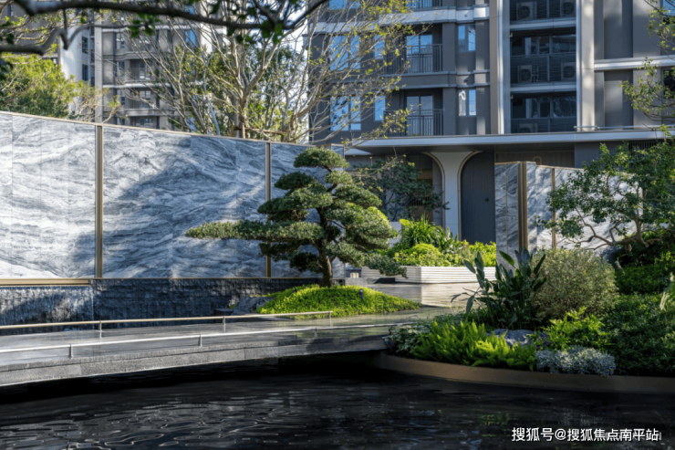 归家动线上,大面落地玻璃框柱了主水景:石材景墙、轻盈小桥、罗汉松、水景与绿化交融,移步换景,有种沉浸式的自然氛围。