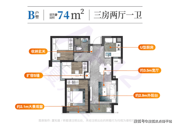 建面约74㎡户型:主卧2.1m大景观窗、U型厨房、3.5米宽厅、S墙扩容收纳、2.9m外阳台…每个指标拿出来,都不像是这个面积能拥有的,空间感对标过去100+㎡户型。
