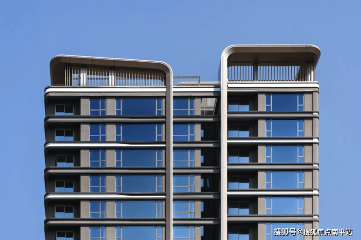 首先,是立面部分,实景效果很赏心悦目:如展翅般的顶部造型+弧形竖向铝板勾勒出了主体,香槟金点缀的横向线条+墙面转角弧形处理+大面玻璃窗,整体灵动感十足,有一种与海同频的通透质感。