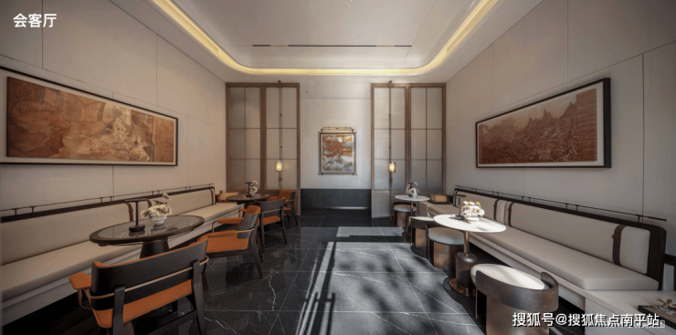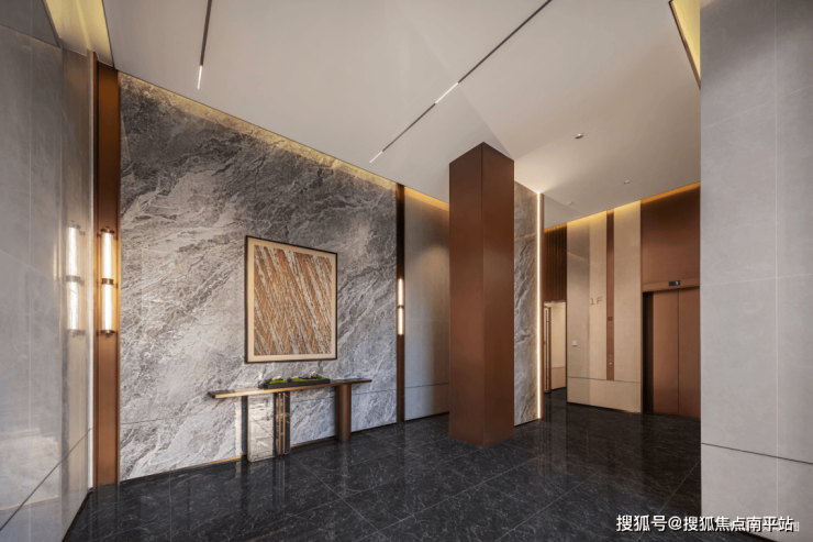 楼栋大堂,岩板背景墙、无主灯悬浮式吊顶、挂画与壁灯,带来了一种归家的轻奢感。