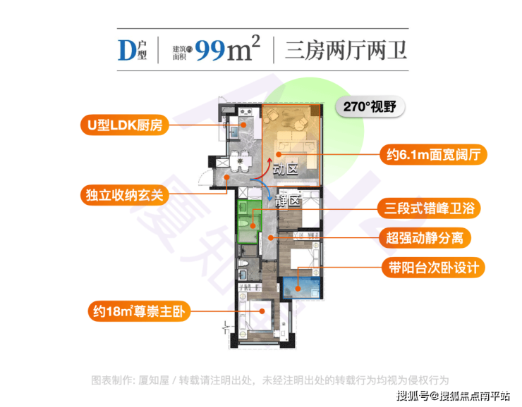 建面约99㎡户型:270°端厅+6.1m的面宽+LDK式的厨房,形成了约30㎡的阔级空间,视野及空间感比肩大平层,同时做到了超强的动静分离,居住很静谧,可谓小面积大享受。