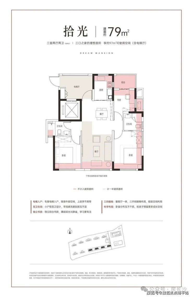 建面约79㎡买3房: 独梯入户、约3.6m客厅开间、三开间朝南、 得房率约123% (含电梯厅),实际可得面积约97㎡。