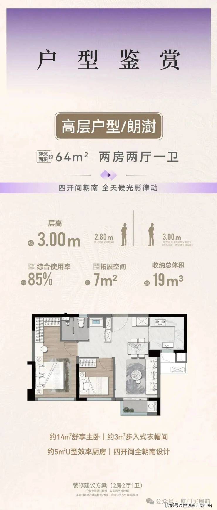 1. 64㎡两房(总价290万起):优点是全朝南、主卧带衣帽间、岛内低门槛;缺点是次卧偏小,两梯五户高峰候梯