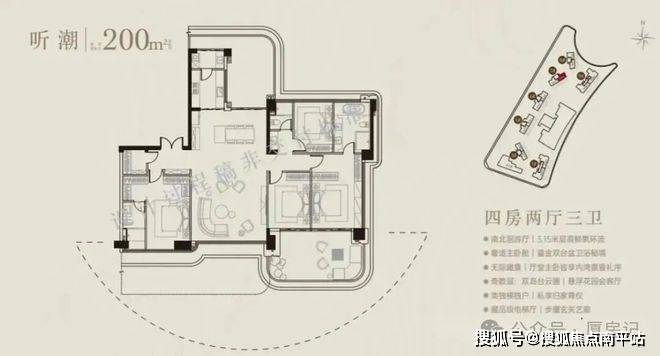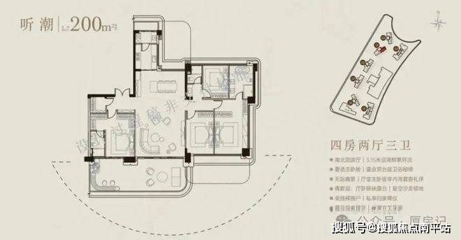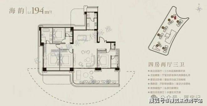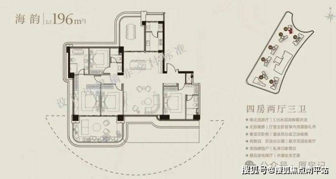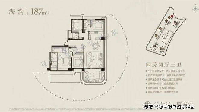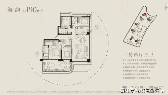 •主推建面约188-436㎡的四代私定大宅,户户带空中花园,综合使用率近100%,最大环幕视野达到270°;其中191㎡户型为四房两厅三卫,有端厅设计,奇数层客厅带露台,偶数层南向露台连接主卧与次卧;436㎡户型为五套间设计,三梯两户,每个房间都能瞰海;