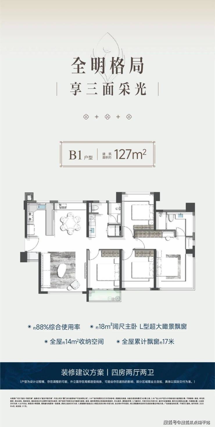 项目规划约979套高层住宅,产品涵盖104-179平全维面积段。主力户型为127-128平四房、其次143/179平四房。