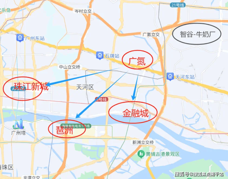 广氮板块 虽然位于广园路以北,但板块距离广园快速和科韵路都很近,从地图上看,广氮板块和珠金琶的实际距离大约为9公里、5公里和7公里,虽然板块内没有地铁,但是自驾到这几个核心商业区不堵车的情况下时间都可以控制在20分钟以内,在天河东的众多板块之中,广氮可以算是最靠近珠金琶的板块之一。