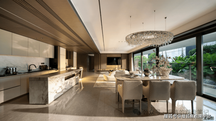 客餐厨环形动线设计,透过11.5m超阔大开间,将江景引入室内。