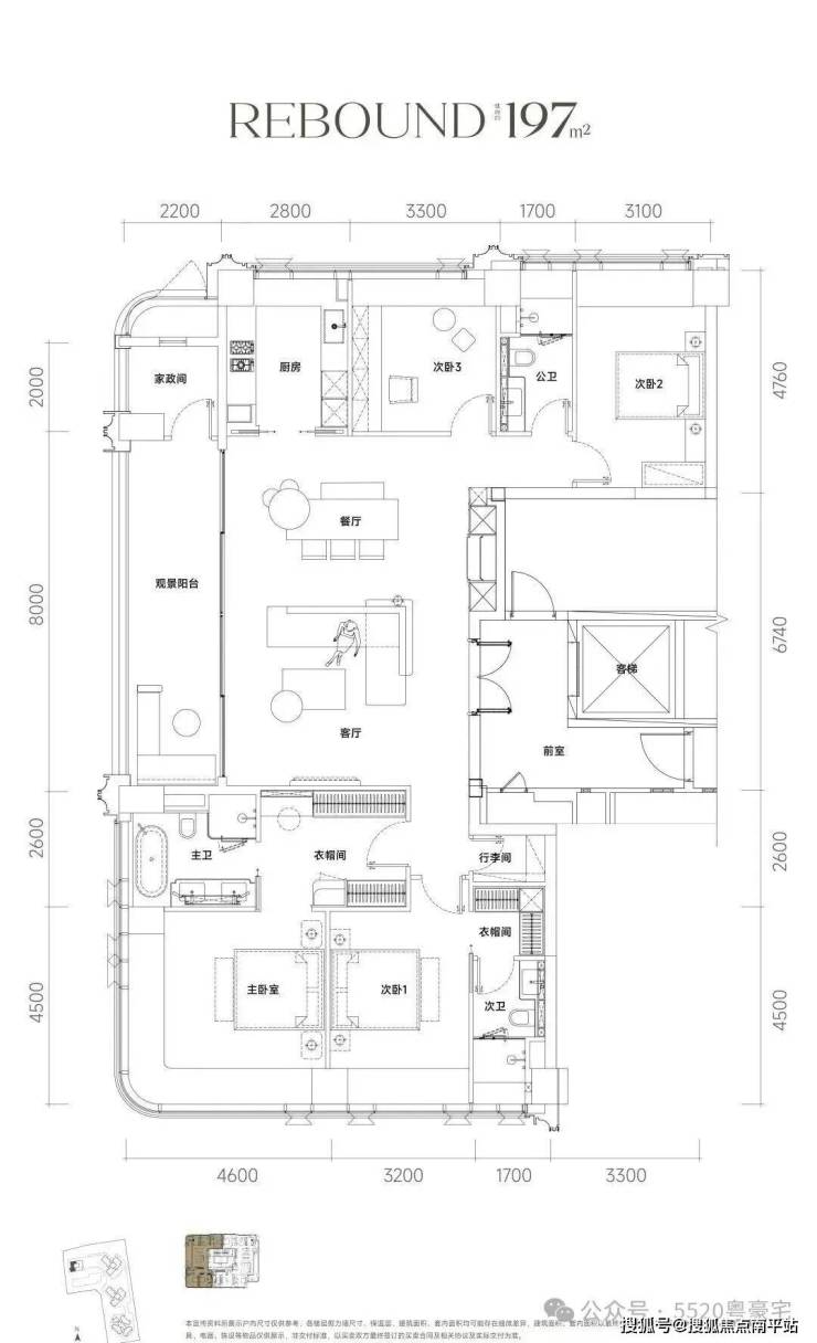 以 197㎡四房三卫户型为例,采用板式结构,南北通透,通风和采光条件绝佳。四开间朝南,客餐厅一体化设计,面宽达 7.8 米,连接约 9.5 米景观阳台,无论是清晨的第一缕阳光,还是傍晚的落日余晖,都能尽情享受。主卧套房配备 270° 转角飘窗和独立衣帽间、双台盆卫浴及浴缸,面积达 35㎡,尊享全景仓视野,为您打造极致的居住体验 。