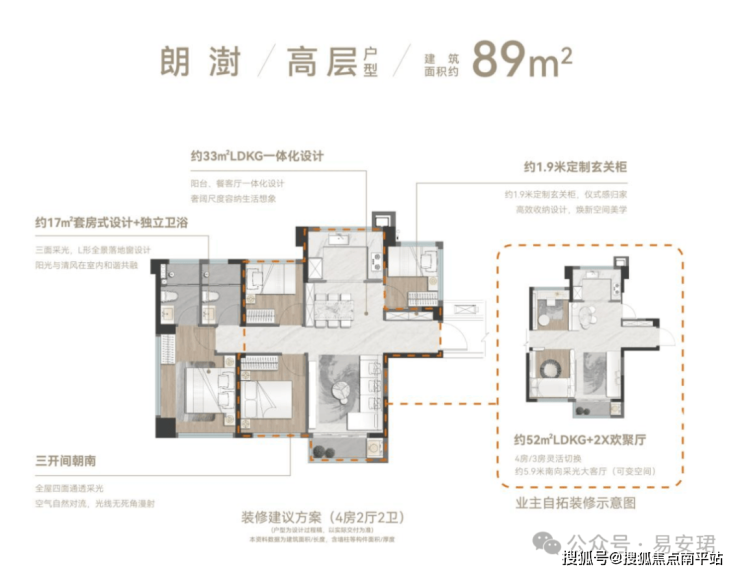 89㎡边套四房得房率90%,创下岛内小面积做到边套四房的先例,让年轻家庭一步到位;高性价比,中高楼层折后总价不会超过410万。