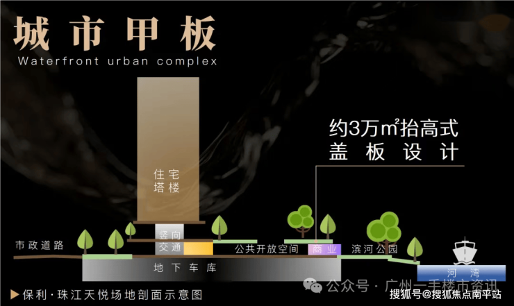 保利为了确保项目低楼层单位每一户都能看江,珠江天悦还借鉴了新加坡港湾城市的设计理念,采用“双层架空盖板”的设计,使得住宅整体楼栋抬高了14米,这种设计保证了项目所有楼层都能享有开阔的江景视野,14米的抬高架空相当于把一楼做到五楼的高度,真正的实现了低楼层也能看江的景观视野。